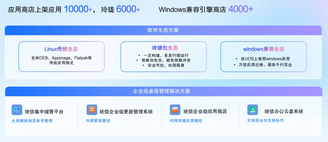软件层面,应用商店上架应用超过 1 万款,玲珑格式包超过 6000 款,Windows 兼容引擎商店提供超过 4000 款 Windows 应用,满足日常办公需求。
