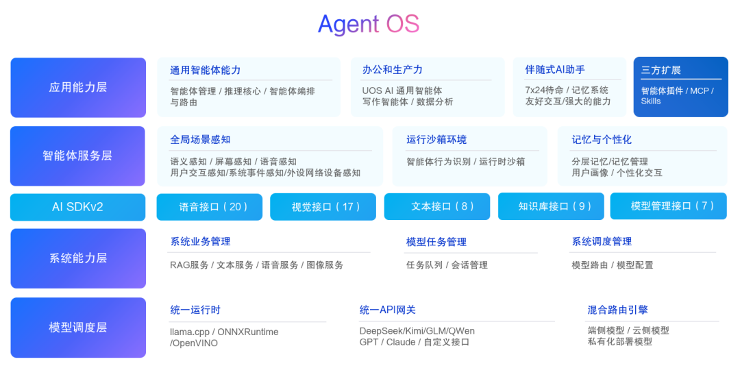 智慧生产力系统升级了 AI 架构,增加了智能体服务层(全局场景感知、运行沙箱环境、记忆与个性化),并构建了通用智能体能力框架,面向办公和生产力场景进行特化优化,提供伴随式 AI 助手。