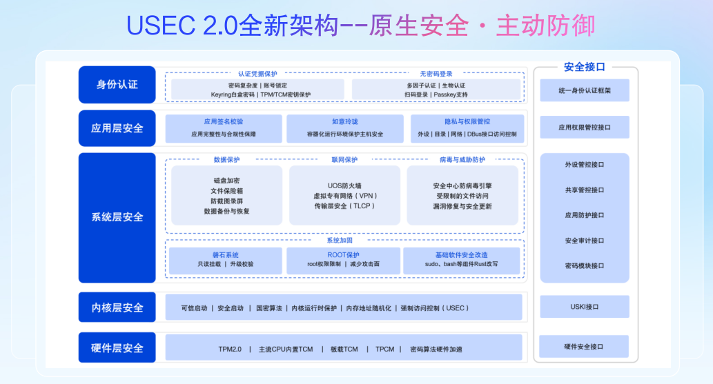 USEC 2.0 在继承 V20 全栈安全架构的基础上,对内核安全、磐石系统、玲珑沙箱等核心模块进行了加强。新增功能包括:统一安全架构、D-Bus 安全加固、企业级磁盘加密系统、软硬件协同防护等。